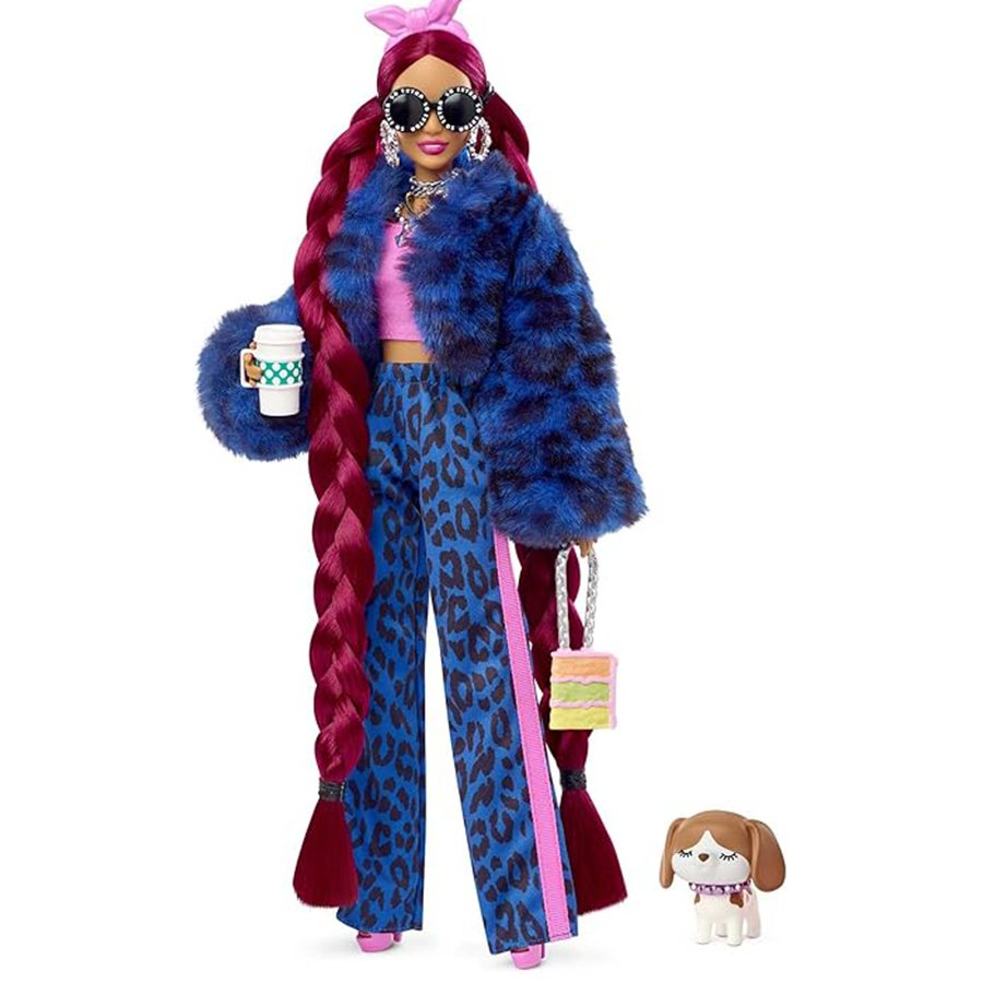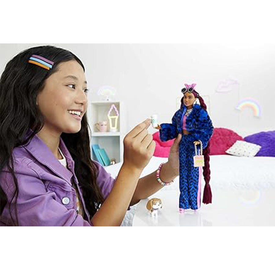 Barbie Extra Doll 17 Leopard-Print Pants, Furry Jacket, Long Hair & Puppy Pet دمية باربي إكسترا 17 بإطلالة النمر، شعر طويل، ومع جرو ظريف وإكسسوارات