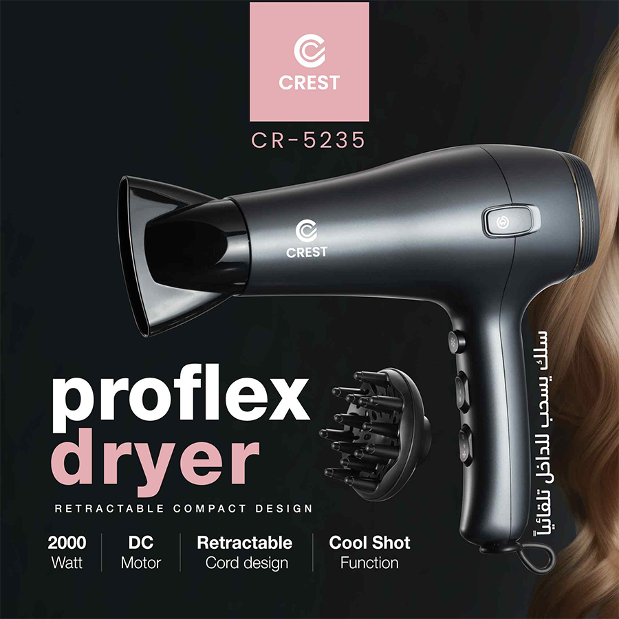 مجفف الشعر بروفلكس يتميز بقوة 2000 واط لتجفيف سريع وفعّال يناسب جميع أنواع الشعر. مزود بمحرك DC يمنحك تحكمًا دقيقًا في السرعة وتدفق الهواء، مما يوفر تجربة تجفيف مخصصة ومريحة تناسب احتياجاتك اليومية.