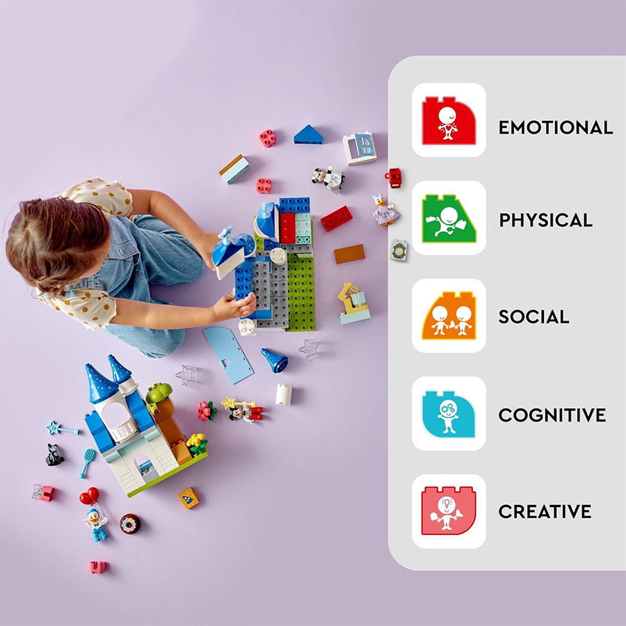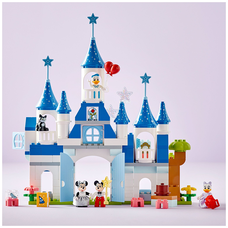 - 5 شخصيات ديزني – يستكشف الأطفال في مرحلة ما قبل المدرسة السمات السحرية للقلعة برفقة 5 شخصيات ليجو دوبلو: ميكي ماوس، وميني ماوس، ودونالد داك، وديزي داك، والقط فيجارو من ديزني.