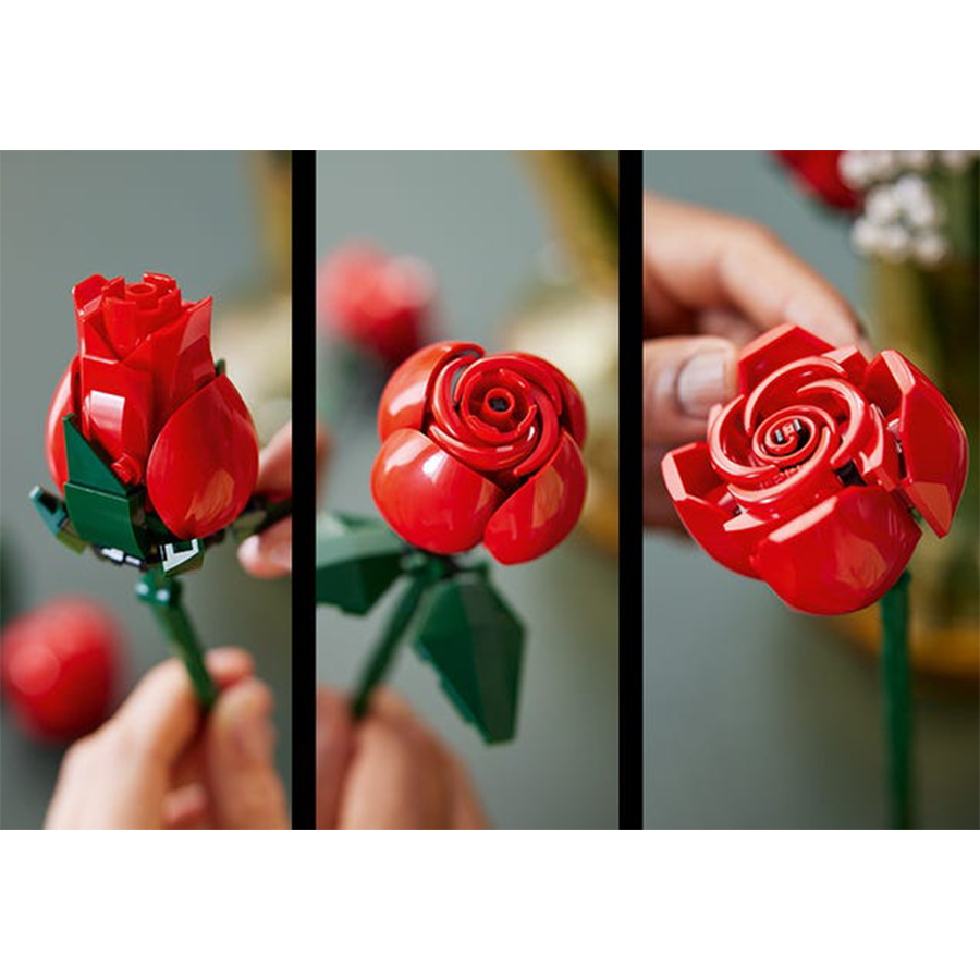 - براعم مزهرة – تصور مجموعة بناء باقة الورود من LEGO Icons الورود التي تم التقاطها في مراحل مختلفة من الإزهار، بما في ذلك 4 ورود في مرحلة الإزهار الكامل، و4 ورود في مرحلة التزهير، و4 ورود في مرحلة البراعم.