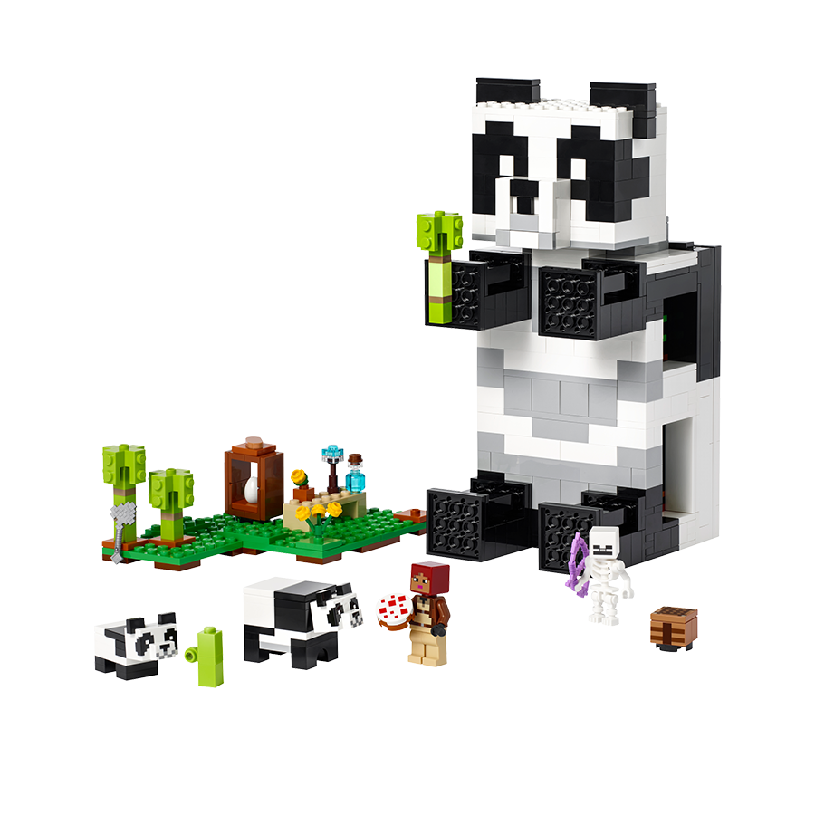 - يتميز بعنصر غابة الخيزران خارج منزل LEGO Minecraft حيث يمكن للأطفال إطعام الكعكة لألعاب الباندا – هوايتهم المفضلة في Minecraft.