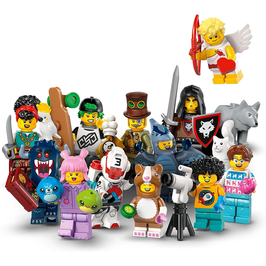 - 12 شخصية مصغرة لجمعها – كل مجموعة متعددة من ألعاب ليغو هي صندوق أعمى غامض ويمكن أن تشمل Wolfpack Beastmaster، Pirate Quartermaster، Steampunk Inventor، Pterodactyl Costume Fan، Bogeyman، Jetpack Racer، Cat Lover، Longboarder، Astronomer Kid، Cupid، Hamster Costume Fan أو Plush Toy Collector.