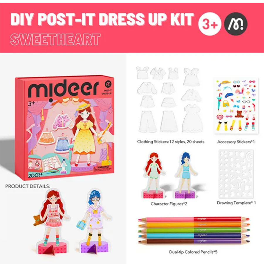 - أطلقوا العنان لإبداعكم مع مجموعة Mideer DIY Post-It Dress Up! تتضمن هذه المجموعة الكاملة أكثر من 200 ملصق قابل لإعادة الاستخدام، وأقلام تلوين ثنائية الأطراف (لونان لكل قلم)، وقوالب رسم، وحاملًا لعرض النماذج. اختاروا زيًا فارغًا ولوّنوه بألوانكم المفضلة، مستخدمين القوالب للإرشاد أو تقنيات الرسم الحر.