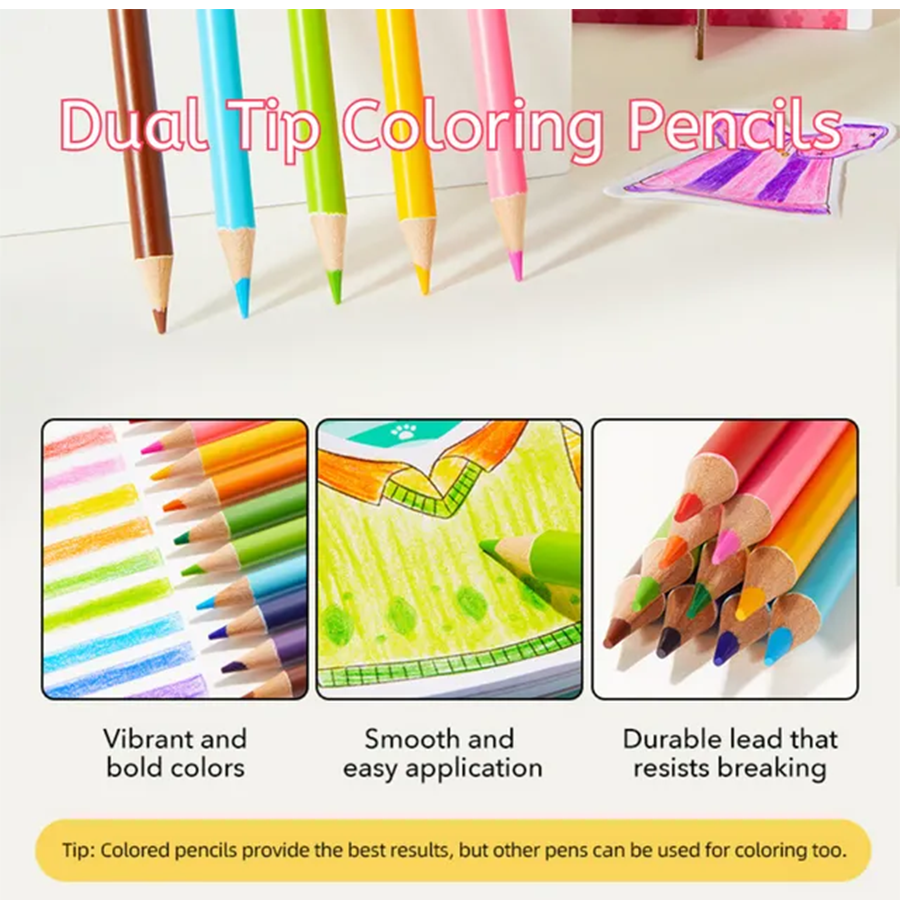 - أقلام رصاص ثنائية الأطراف (لونان لكل قلم) برأس ناعم ومتين لسهولة التلوين.