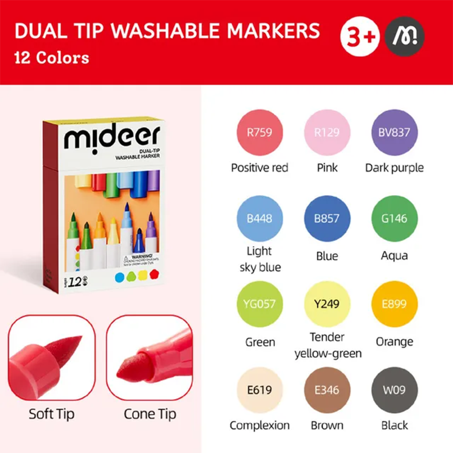 - توفر أقلام Mideer ثنائية الرأس القابلة للغسل للفنانين الصغار أداة آمنة ومبتكرة مصممة لتدوم طويلًا. مصممة برأس مخروطي ورأس ناعم، تتيح هذه الأقلام أنماط رسم متعددة، من التفاصيل الدقيقة إلى الخطوط العريضة.