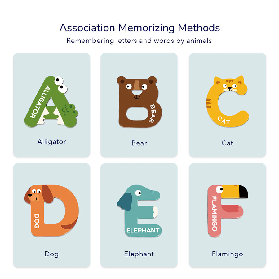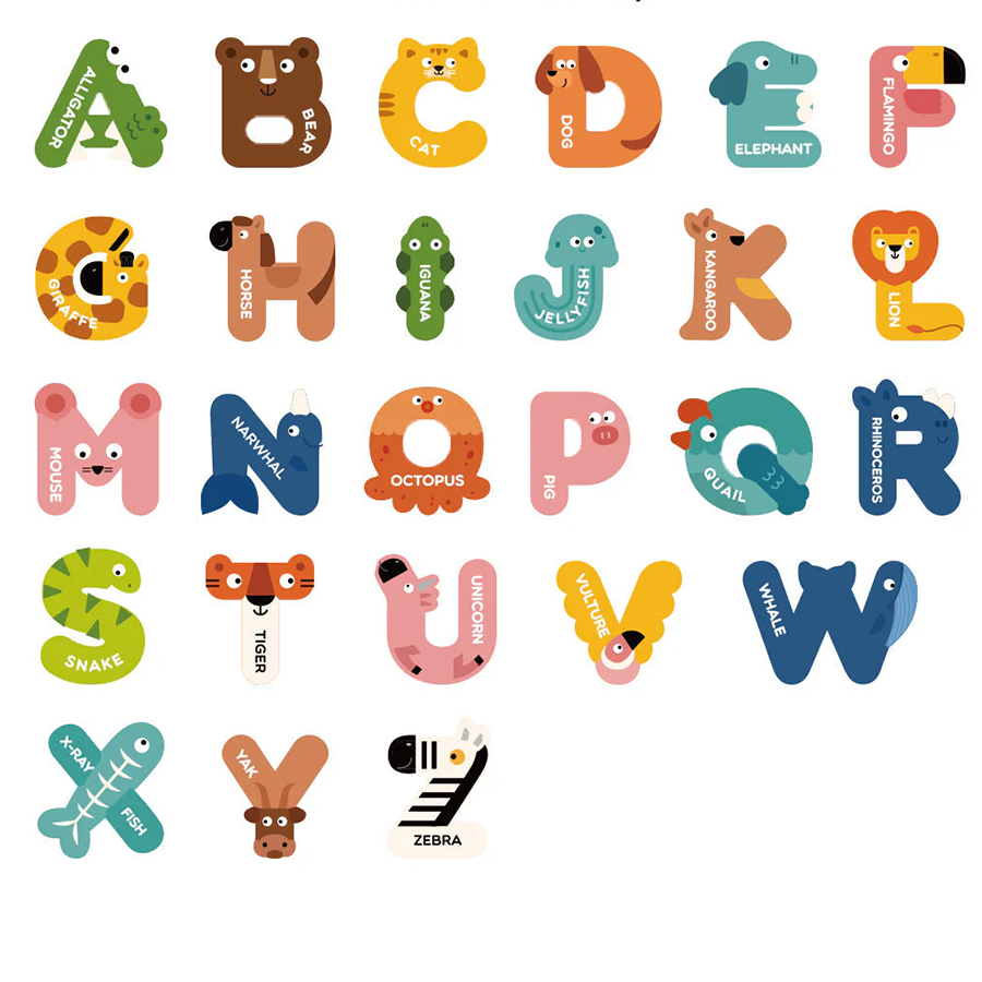 هذه المجموعة مخصصة للحروف. كل مغناطيس يحتوي على حرف، وحيوان، واسمه.