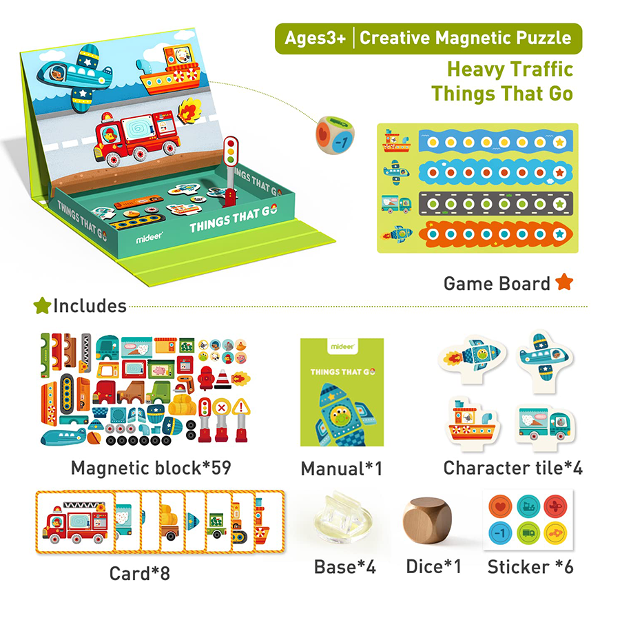 مجموعة ألعاب مغناطيسية لإنشاء قواعد المرور الخاصة بك. هذه لعبة رائعة للعب في المنزل أو أثناء التنقل. يمكن استخدام هذه اللعبة 2 في 1 كلعبة مغناطيسية تقليدية أو لعبة لوحية ممتعة. يعمل هذا على تحسين مهارات التعرف على الأشكال والألوان، وقدرات التعلم، والبراعة اليدوية.