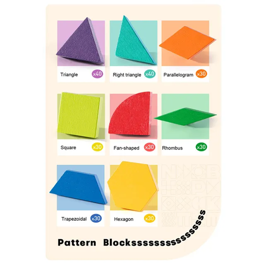 - تأتي هذه المجموعة مع ٢٥٠ مكعبًا خشبيًا بأشكال وأحجام وألوان مُختلفة، مُصممة لمساعدة الأطفال على تطوير مهاراتهم الهندسية.