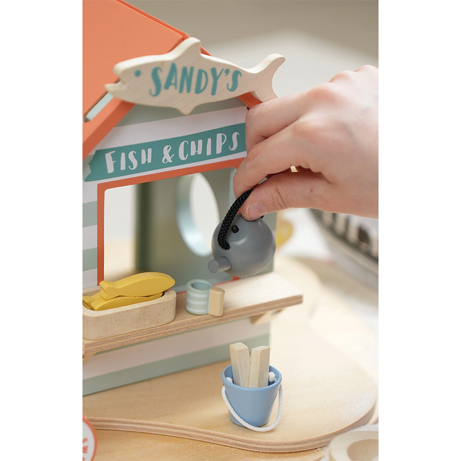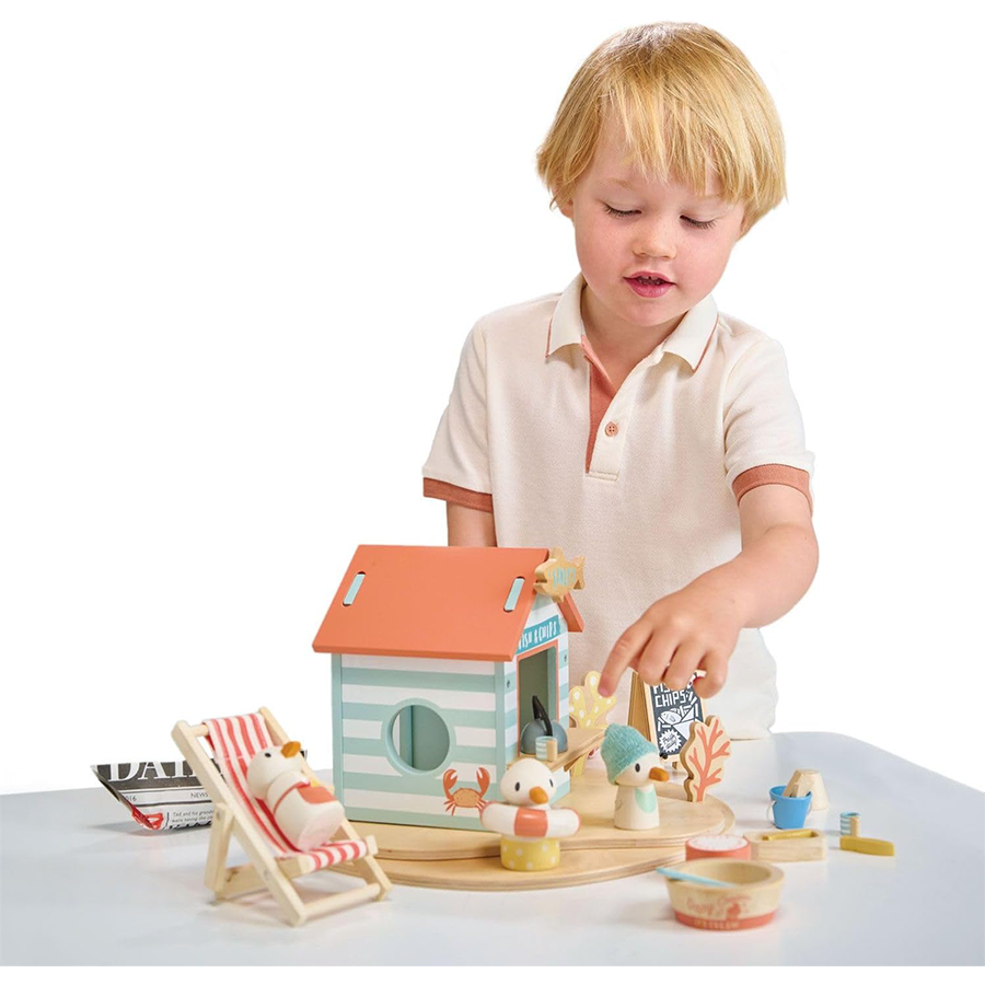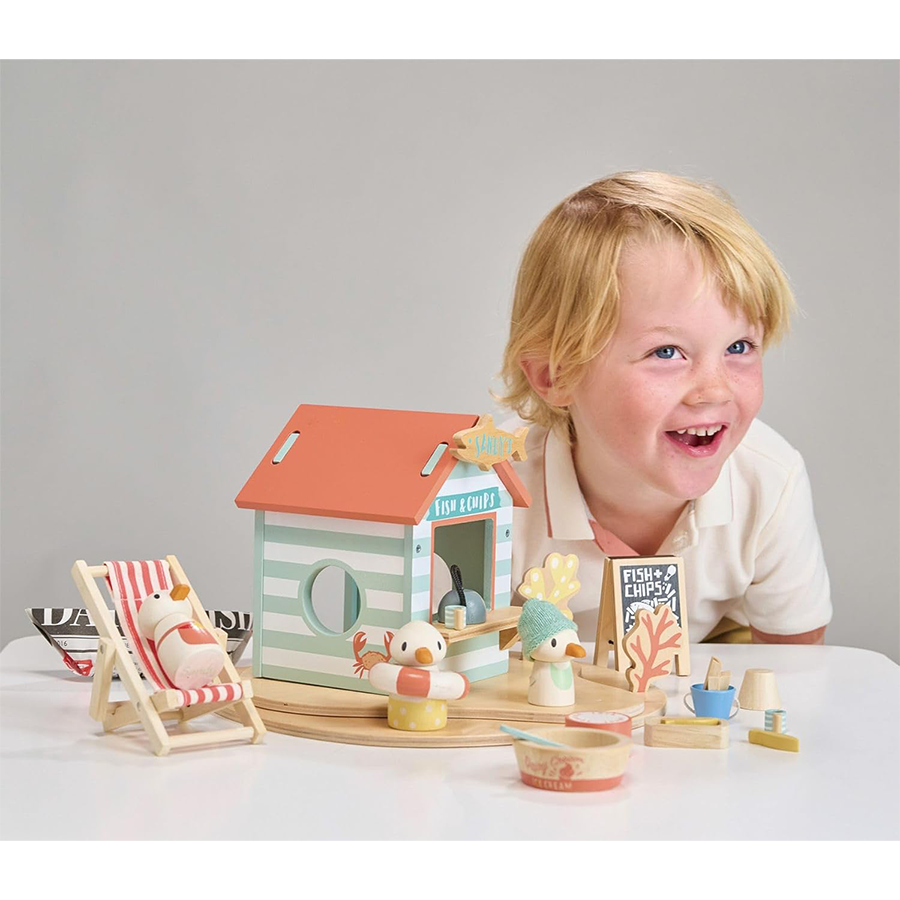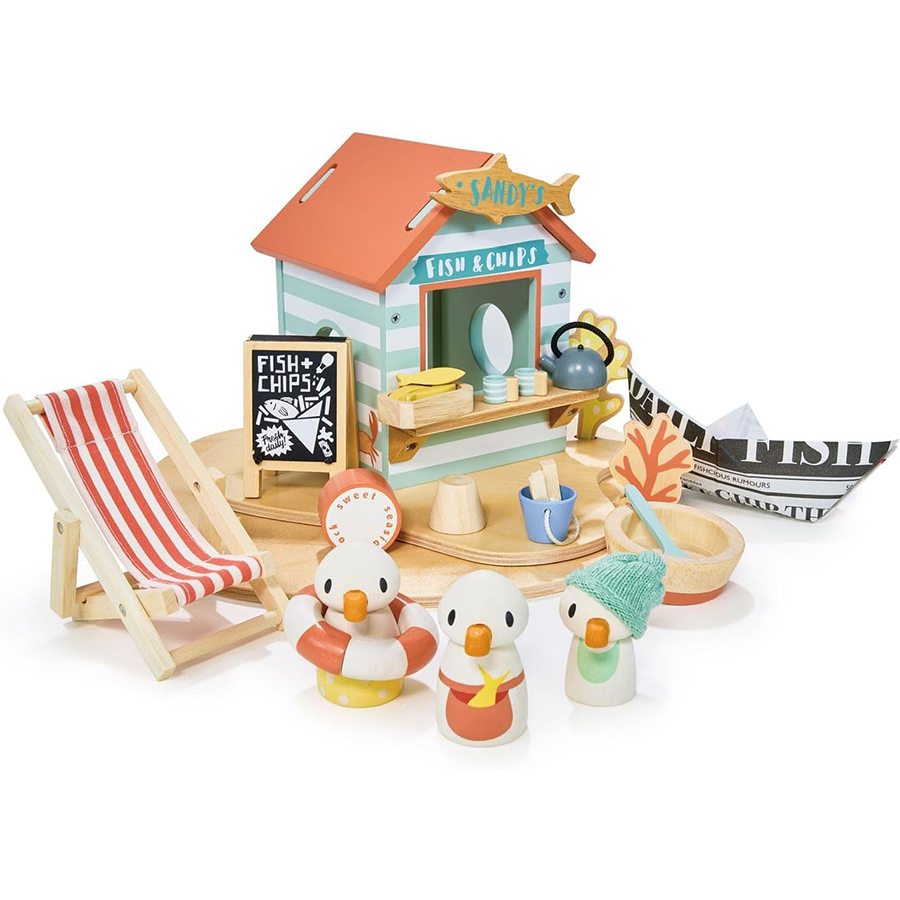 - يا إلهي! – هذه المجموعة الرائعة تتضمن تفاصيل دقيقة للغاية! ٣ شخصيات بأسماء مطبوعة أسفلها، كوخ شاطئ بسقف قابل للإزالة، قاعدتان من الخشب الرقائقي تشبهان الرمل، قطعتان من الأعشاب البحرية، كرسي استلقاء للتشمس، غلاية، وعاء خشبي من الآيس كريم وملعقة، ٣ أسماك في طبق، دلو مع بطاطس مقلية، لافتة سمك وبطاطس مقلية، قلعة رملية، قطعة من حلوى السكر، وقارب مصنوع من ورق الجرائد. يرتدي جولي، طائر النورس الأب، قبعة محبوكة وحلقة مطاطية خشبية قابلة للإزالة. أبعاد المنتج ١٠٫٦٣ × ١٠٫٠٤ × ٦٫٦٩ بوصة.