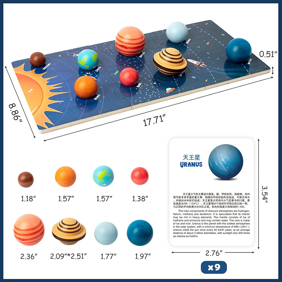 • 【المحتويات】تحتوي هذه اللعبة على 8 كرات خشبية ذات طابع كوكبي، و8 بطاقات تعليمية مع تفسيرات لكل كوكب، و3 قطع من الألغاز التي يمكن تجميعها معًا لتشكيل نظام شمسي كرتوني.